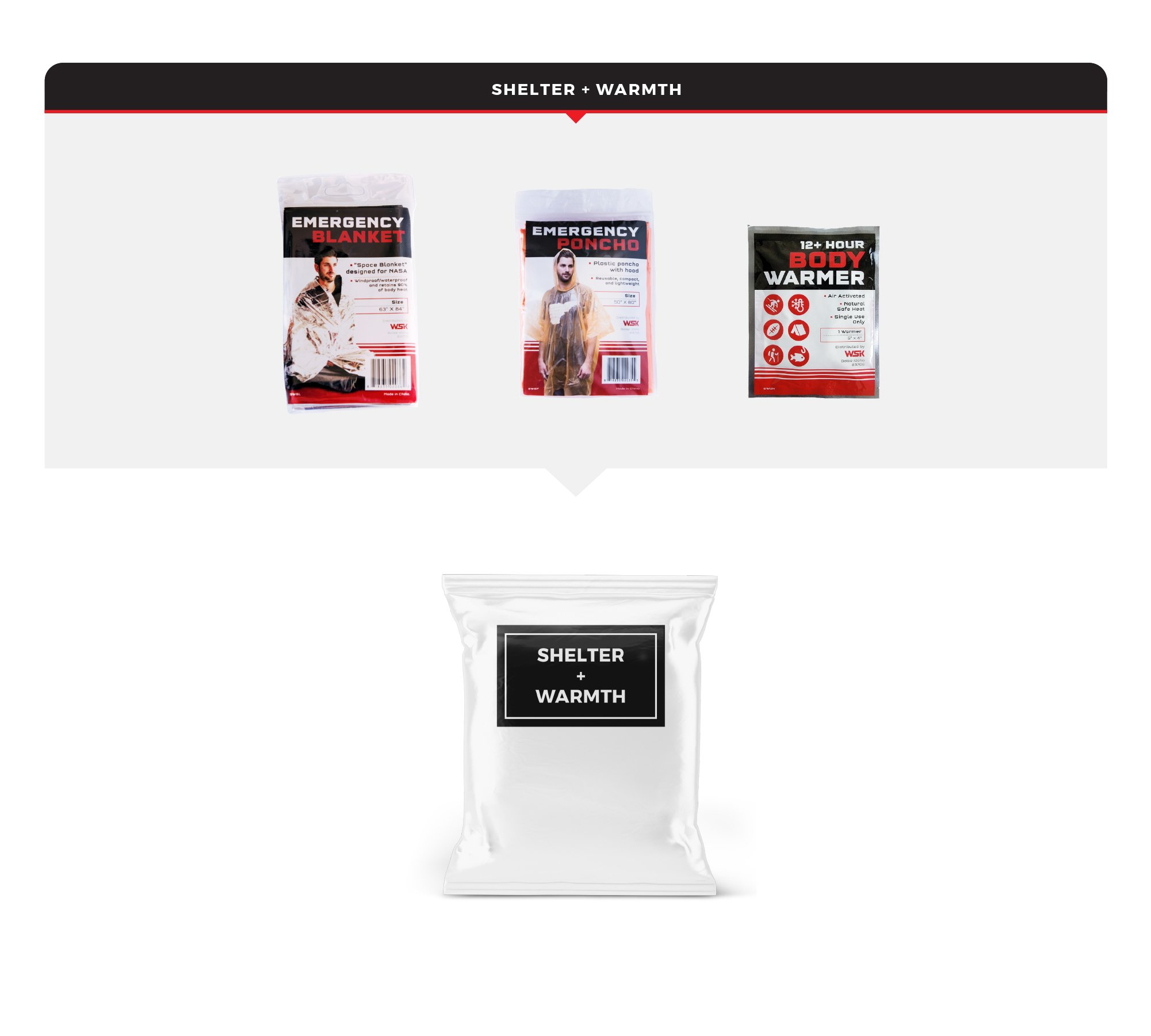 This kit includes the following: Food and Water: The food and water in this kit have a 5-year shelf life, and are meant to provide nutrition for 72 hours. (12) 4 oz. Water Pouches (9) 400-Calorie Food Bars (10) Water Purification Tablets - each tablet purifies 1 liter of water (1) 1-Liter Hydration Bag with Straw Tools and First Aid: These tools can be useful when you need help with navigation, transport, personal protection, or shelter. A first aid kit can be used to treat minor injuries and protect against more serious health threats in a disaster. (1) Notepad & Pencil (1) Small Bandage Kit (3) Alcohol cleansing pads (1) Butterfly closure (10) Cotton tip applicators (2) Gauze pads (10) Plastic bandages (3/4'' x 3'') (10) Plastic bandages (3/8'' x 1 1/2'') (1) Reusable case (1) 5 in 1 Emergency Whistle (1) Multi Function Pocket Knife (1) Pair of Safety Goggles (1) Small Sewing Kit Light and Communication: These items can come in handy if you experience a home power outage, car trouble, or other emergencies. (1) AM/FM Radio (batteries included) (1) Deck of Survival Playing Cards - 52 cards illustrating valuable survival skills that will educate and entertain you in an emergency (1) 30+ Hour Candle (1) Hand Rechargeable Flashlight (never needs batteries) (1) Flint Starter Shelter and Warmth: These supplies will protect you from wind, sun, rain, and other harsh conditions. (1) Emergency Blanket (1) Emergency Poncho (1) Hand/Body Warmer Hygiene and Sanitation: Hygiene is important in a disaster; staying clean can protect against infection, disease, and depression. (1) Deluxe Hygiene Kit (1) 0.25 oz. Hand and Body Lotion (1) 0.34 oz. Shampoo and Conditioner (1) Bar of soap (1) Comb (1) Deodorant Gel (3) Maxi Pads (1) Pocket Tissue Pack (1) Shaving Cream Packet (1) Toothbrush (1) Toothpaste (1) Toothpick (1) Twin Blade Razor (1) Washcloth (9) Wet Wipes (3) Disposable Face Masks (1) Biohazard Waste Bag Emergency Survival Kit Information: This kit was designed using advice from experts in the field of emergency preparedness. It follows guidelines offered by government agencies and nonprofit preparedness organizations. Formerly known as Guardian Survival Gear Deluxe Survival Kit