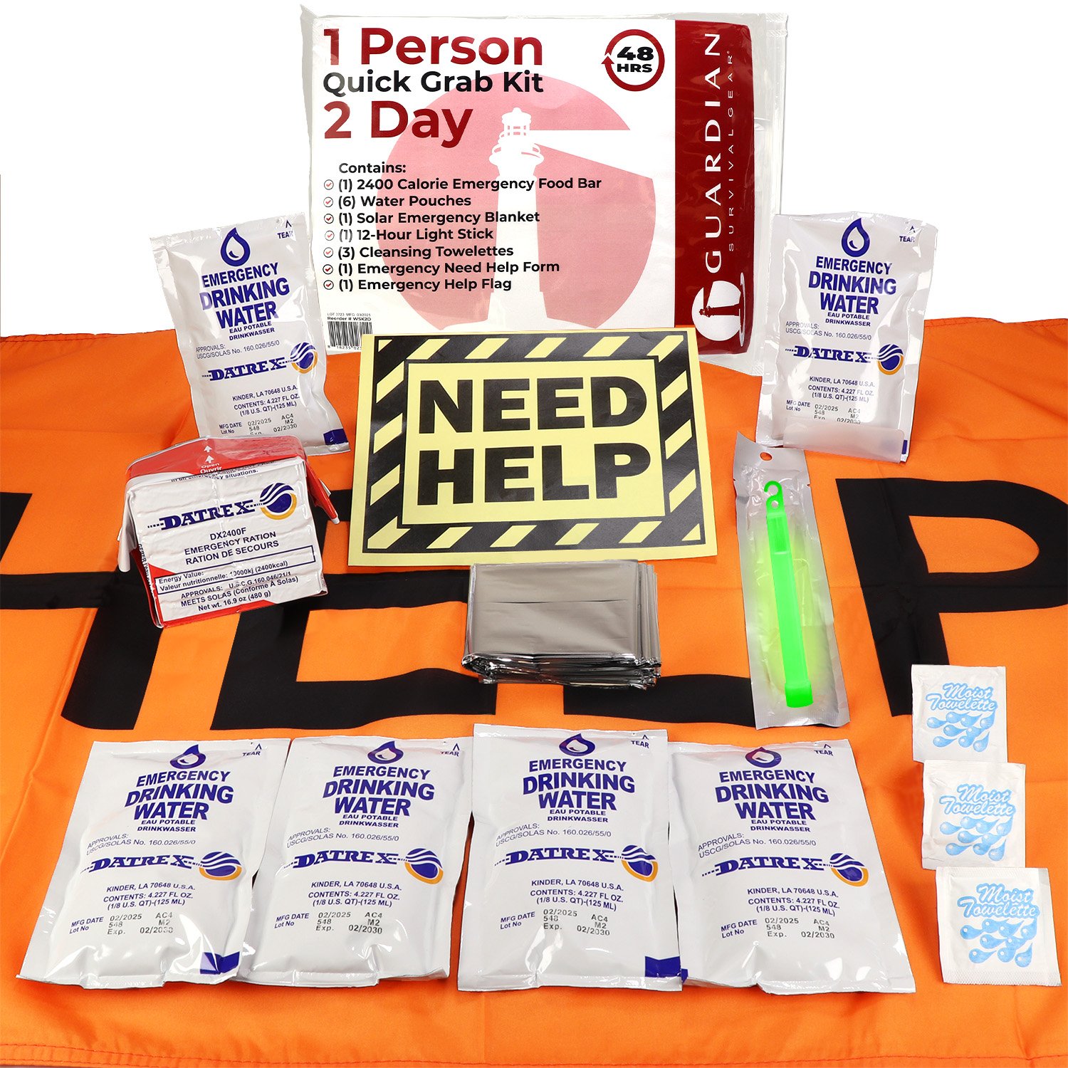 Be ready for any emergency with the 2 Day Quick Grab Kit. This lightweight, compact kit is packed with essential survival items for one person, all conveniently stored in a resealable bag for easy access and portability. Contents Include: 3 Cleansing Towelettes: Maintain hygiene and freshness in challenging conditions. 1 Mylar Blanket: Compact thermal blanket designed to retain body heat and provide warmth. 1 2400kcal Food Bar: Long-lasting emergency food ration with vital nutrients to sustain energy. 1 High Visibility Help Flag: Bright orange help flag with grommets and measuring 24"x36" allows you to signal for assistance no matter where you are. 6 Water Pouches (4.2 oz each): Securely sealed, clean drinking water for hydration on the go. 1 12-Hour Bright Stick: Reliable, long-lasting light source for visibility and safety in dark conditions. Ideal for home, car, or workplace preparedness, the 2-Day Quick Grab Kit ensures peace of mind in any situation. Whether evacuating, dealing with civil unrest, or hunkering down during a natural disaster. The 2 Day Quick Grab Kit has the essentials needed for preparedness. Also available in a 3 day variant. Emergency Survival Kit Information: This kit was designed using advice from experts in the field of emergency preparedness. It follows guidelines offered by government agencies, ready.gov and nonprofit preparedness organizations.
