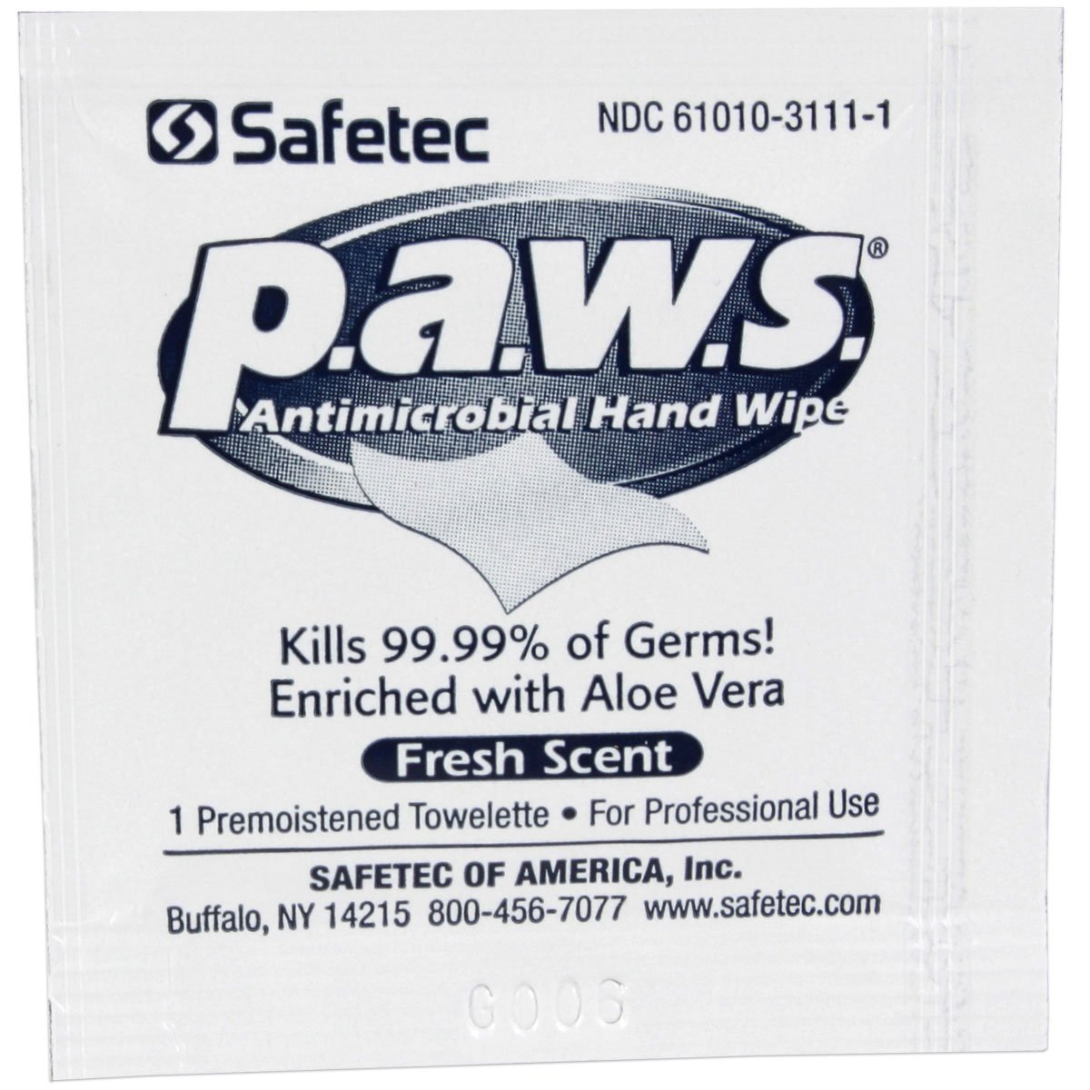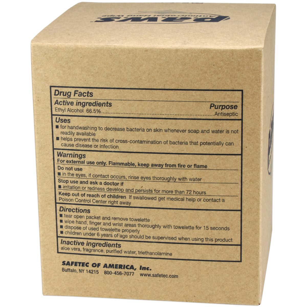 5"x8" Personal Antimicrobial (kills germs) Wipe - 100 Per Boxp.a.w.s. antimicrobial hand wipes are formulated with 66.5% ethyl-alcohol to help you meet CDC, APIC and OSHA hand washing recommendations and aloe vera to add moisture with each use. The individually wrapped p.a.w.s. towelettes come in convenient mini pouches and pull out canisters. p.a.w.s. wipes not only kill 99.99% of germs, but they also remove debris and soil from hands and under fingernails, an important function in the absence of soap and water. p.a.w.s. has demonstrated virucidal activity against HIV and Avian Flu A in 15 seconds. (Results of in vitro time kill test studies) P.A.W.S Antimicrobial Hand Wipes - p.a.w.s. Antimicrobial Hand Wipes are formulated with 66.5% ethyl-alcohol to kill 99.99% of germs and contain aloe vera to keep your skin feeling soft and smooth all day long. They also remove debris and soil from hands and under fingernails, an important function in the absence of soap and water. Wipe Size: 5? x 8? Buy American Safetec manufactures higher quality products by following strict compliance regulations with faster shipping advantages. Pandemic and infection control product Meets OSHA, APIC and CDC hand washing recommendations in the absence of soap and water In convenient individually wrapped mini pouches Cleans and Sanitizes All In One Kills 99.9% of Most Common Germs Enriched with Aloe Vera to add Moisture with Each Use Helps Reduce the Risk of Cross-Contamination and Infection Safetec p.a.w.s. Antimicrobial Hand Wipes Helps Reduce the Risk of Cross-Contamination and Infection Formulated with 66.5% ethyl-alcohol to help you meet CDC, APIC and OSHA handwashing recommendations. P.a.w.s. wipes sanitize while removing soil and debris from hands, an important function in the absence of soap and water. Convenient packaging is great for first aid kits, the office, purses, bags, hospitals, vehicles and workshops. Make hand hygiene a priority at your facility! Provide p.a.w.s. to your staff for effective, proven protection against potential infections and germs.Wipe: 5" x 8" / Pouch: 2.13" x 2.19" / Box: 4.25" x 4.25" x 5.9" Learn more about how these wipes help reduce the Risk of Cross-Contamination and Infection