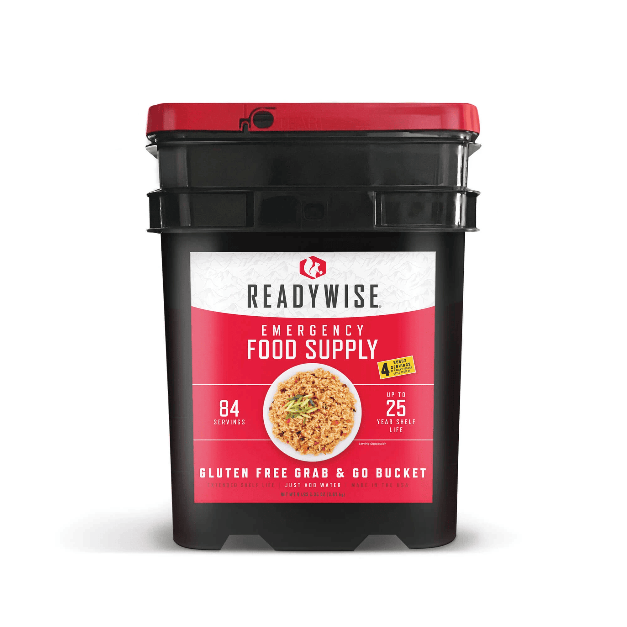 Our 84 serving gluten free grab & go bucket is a perfect addition to any food supply. Whether you're affected by a snow storm, hurricane or other weather emergency, it's wise to be prepared. These great-tasting freeze-dried and dehydrated foods are ready in minutes when you just add water. They also come in stackable buckets with an easy Grab-N-Go handle, so they're easy to store and transport. What's included in this kit? 3 pouches of Teriyaki and Rice (12 Servings) 4 pouches of Loaded Baked Potato Casserole (16 Servings) 3 pouches of Tomato Basil Soup (16 Servings) 3 pouches of Potatoes and Chicken Flavored Pot Pie (12 Servings) 7 pouches of Creamy Yogurt Style (28 Servings)   Additional Product Details: Includes 1 total bucket Total calories: 13,320 Food is safely sealed in Metallyte™ pouches To avoid waste, each pouch conveniently contains 4 servings Grab-and-go handles for easy transport in an emergency 25 year shelf life Total Weight: 12 lbs Dimensions: 11.75" x 9.75" x 14.75"