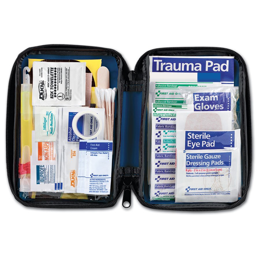 Be ready for all potential emergencies with this vehicle first aid kit: perfect for all potential emergencies when on the road. Our new generation of Soft sided kit is developed to save time and frustration in the midst of emergency situations. An economical first aid kit for your automobile in a convenient size. Kit Includes: MEDS/ANTISEPTICS (4) Extra-strength non aspirin tablets (2) Motion sickness tablets (4) Ibuprofen tablets (6) Alcohol cleansing pads (9) BZK antiseptic towelettes (1) Insect sting relief pad (3) First aid cream packs BANDAGES (30) Adhesive plastic bandages, 3/4" x 3" (2) Elbow & knee plastic bandages, 2" x 4" (10) Junior adhesive plastic bandages, 3/8" x 1-1/2" (2) Knuckle fabric bandages (2) Fingertip fabric bandages INJURY TREATMENT (1) Trauma pad, 5" x 9" (6) Gauze dressing pads, 2" x 2" (1) Sterile eye pad (1) First aid tape roll, 1/2" x 5 yd. (1) Moleskin, blister prevention, 2" x 2" (2) Butterfly wound closures (1) Finger splint, 6" x 3/4" REFS/INSTRUMENTS (1) Light stick (1) "Call 911" distress flag (1) First aid guide/ Accident report form (2) Exam quality vinyl gloves (10) Exam quality vinyl gloves (1) Durable, clear-pocket softpack