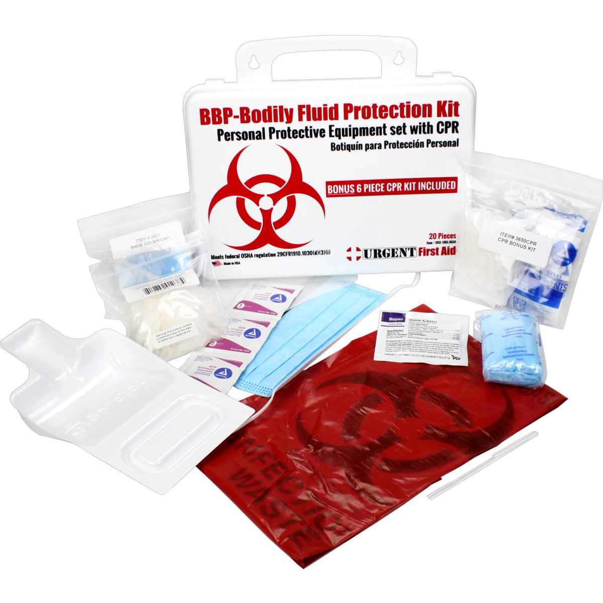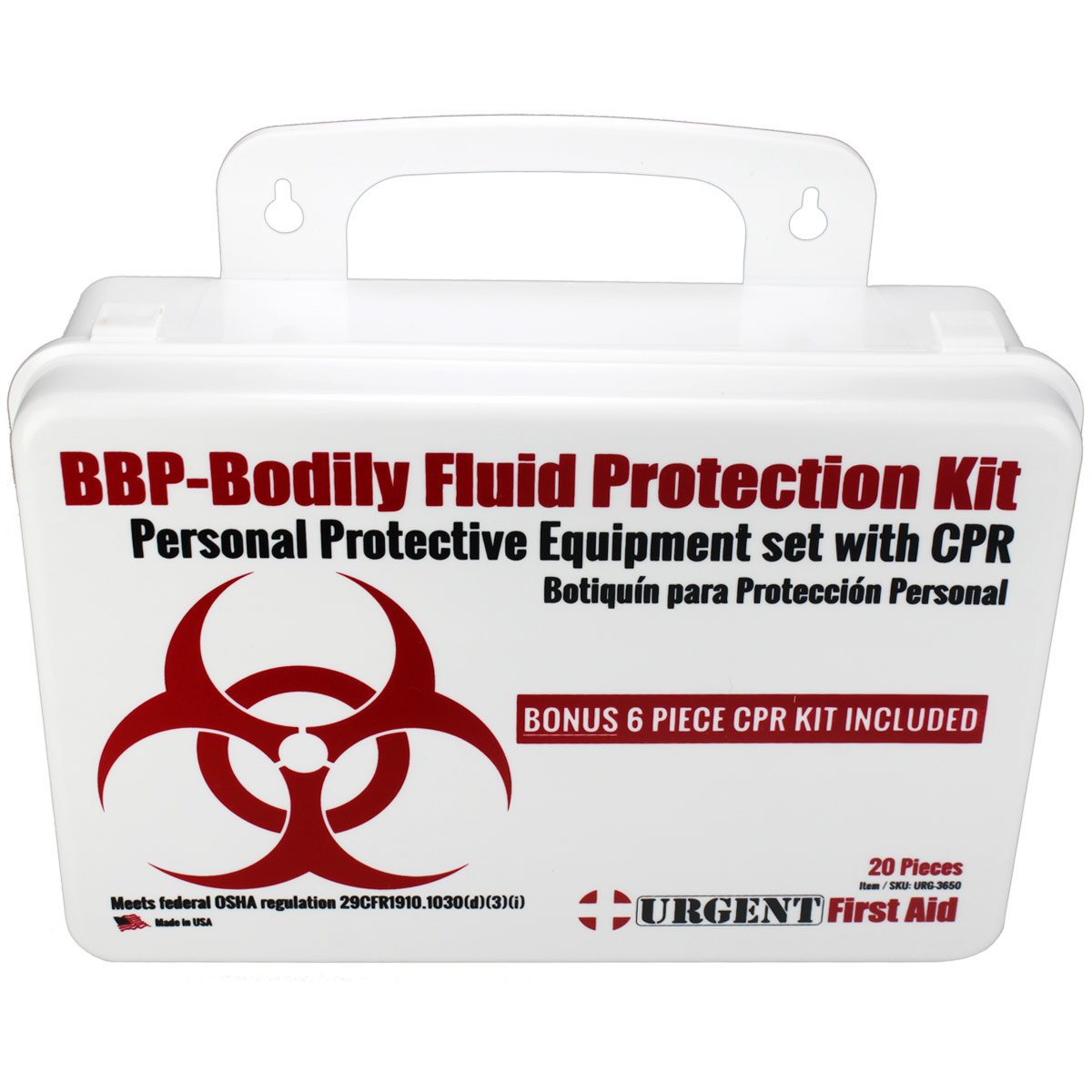 BBP / Bodily Fluid Protection Kit with Bonus 6 piece CPR kit for additional Rescuer Protection Botiqu n de protecci n personal OSHA compliant Personal Protection Kit, Bloodborne Pathogen (BBP) and Other Potentially Infectious Materials (OPIM) Bodily Fluid Spill Clean Up Kit includes a Bonus 6 piece CPR Pack, Plastic Case with gasket This Urgent First Aid 24-piece, personal protection kit is designed to guard persons attending to the injured or ill against contact with infections carried in blood and body fluids. Greatly reduce infectious risk factors your workers face every day from improper body-fluid spill clean-up. (Many companies specifically require this kind of protection.) This kit includes a CPR one-way valve face shield as part of the complete head-to-toe defense package against bio-hazardous contaminants. Every aspect of this kit meets with federal OSHA recommendations. Products are contained in a sturdy, reusable plastic case that can be easily carried or mounted on a wall. Our Made-in USA BBP kit is assembled in California in a gasketed case to help keep moisture and dust away from the content and keep your protective gear ready to use in an emergency. Meets federal OSHA regulation 29 CFR1910.1030 (d)(3)(i) - Satisface la regulaci n federal de OSHA Personal Protection Kit: (1) Instruction/Contents Insert (1) Vinyl Exam Gloves, Pair (1) Face Mask with Eye Shield (1) Impervious Gown (2) Disposable Shoe Covers (1) Disposable Bonnet (3) Antiseptic BZK Wipes (1) Germicidal Wipe (1) Paws Antimicrobial Wipe (1) Fluid Control Solidifier, 3/4 oz (1) Absorbent Towel (1) Red Biohazard Bag, 24 x 24 (2) Twist Ties (1) Scoop & Scraper (1) First Aid Kit Case, Plastic with Gasket CPR Pack: (1) CPR Shield with One Way Valve and Barrier Filter (1) Vinyl Exam Gloves, Pair (3) Antiseptic BZK Wipes Buy American! Assembled in the USA of domestic and imported content in an FDA certified facility and using American Labor. Meets federal OSHA regulation 29CFR1910.1030(d)(3)(i) Provision. When there is occupational exposure, the employer shall provide, at no cost to the employee, appropriate personal protective equipment such as, but not limited to, gloves, gowns, laboratory coats, face shields or masks and eye protection, and mouthpieces, resuscitation bags, pocket masks, or other ventilation devices. Personal protective equipment will be considered appropriate only if it does not permit blood or other potentially infectious materials to pass through to or reach the employee s work clothes, street clothes, undergarments, skin, eyes, mouth, or other mucous membranes under normal conditions of use and for the duration of time which the protective equipment will be used.