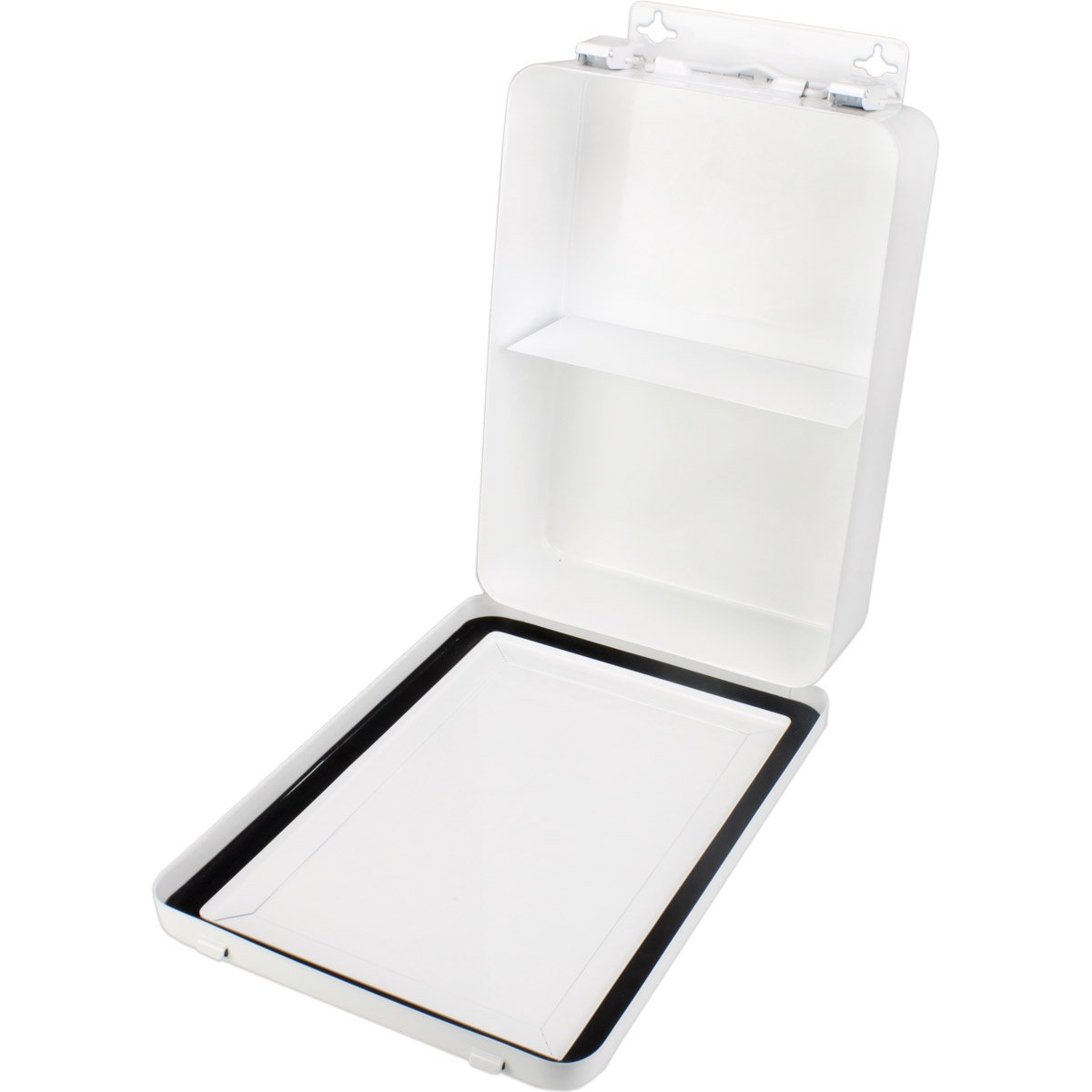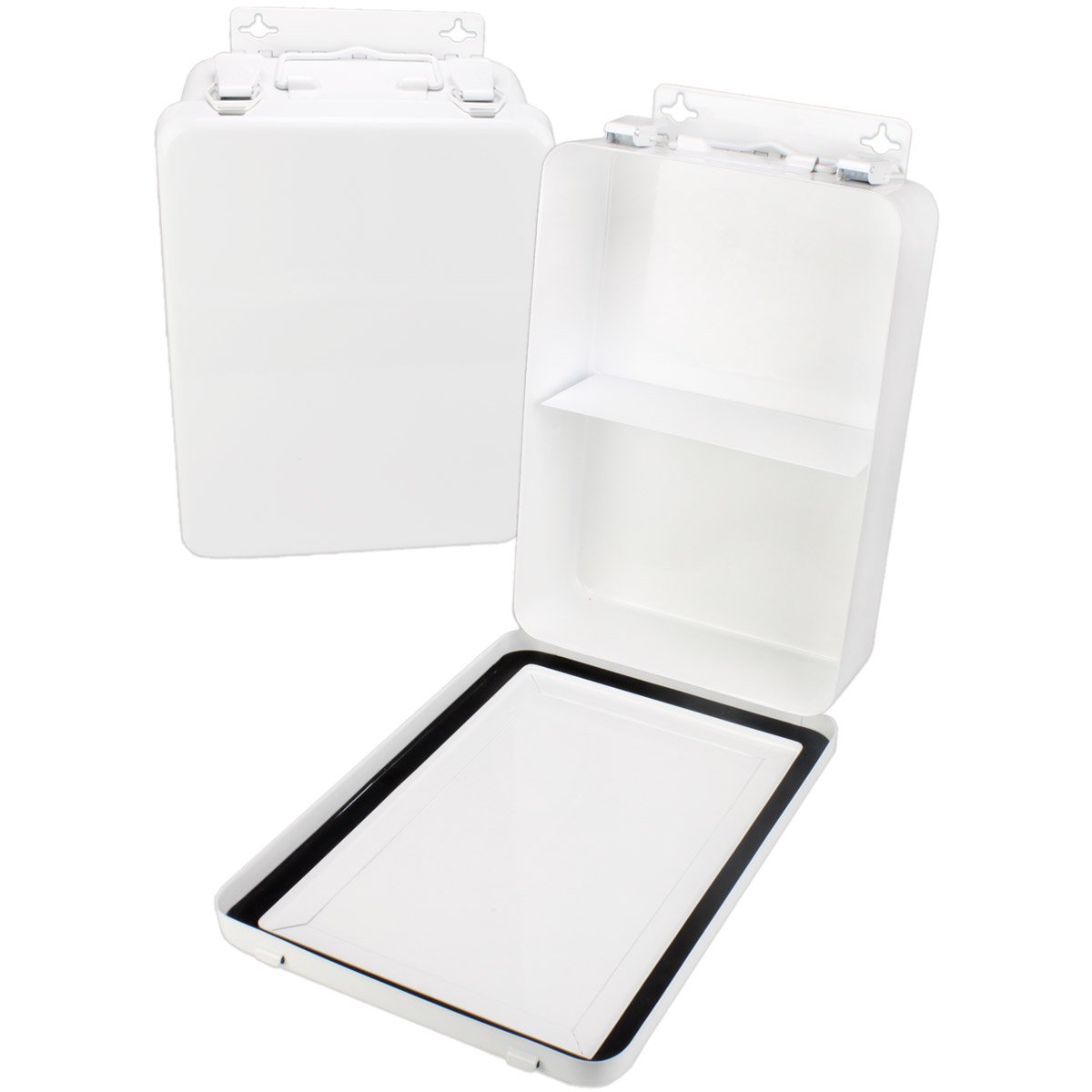 16 Unit, Empty Metal Case, 1 Shelf, Hinged w/ Gasket, 6-5/16"x9-1/16"x2-3/8", Vertical - 1 Each This vertically configured empty metal first aid case holds up to 16-units of products and features a hanger and gasket. Kit Dimensions: 6-5/16"x9-1/16"x2-3/8"