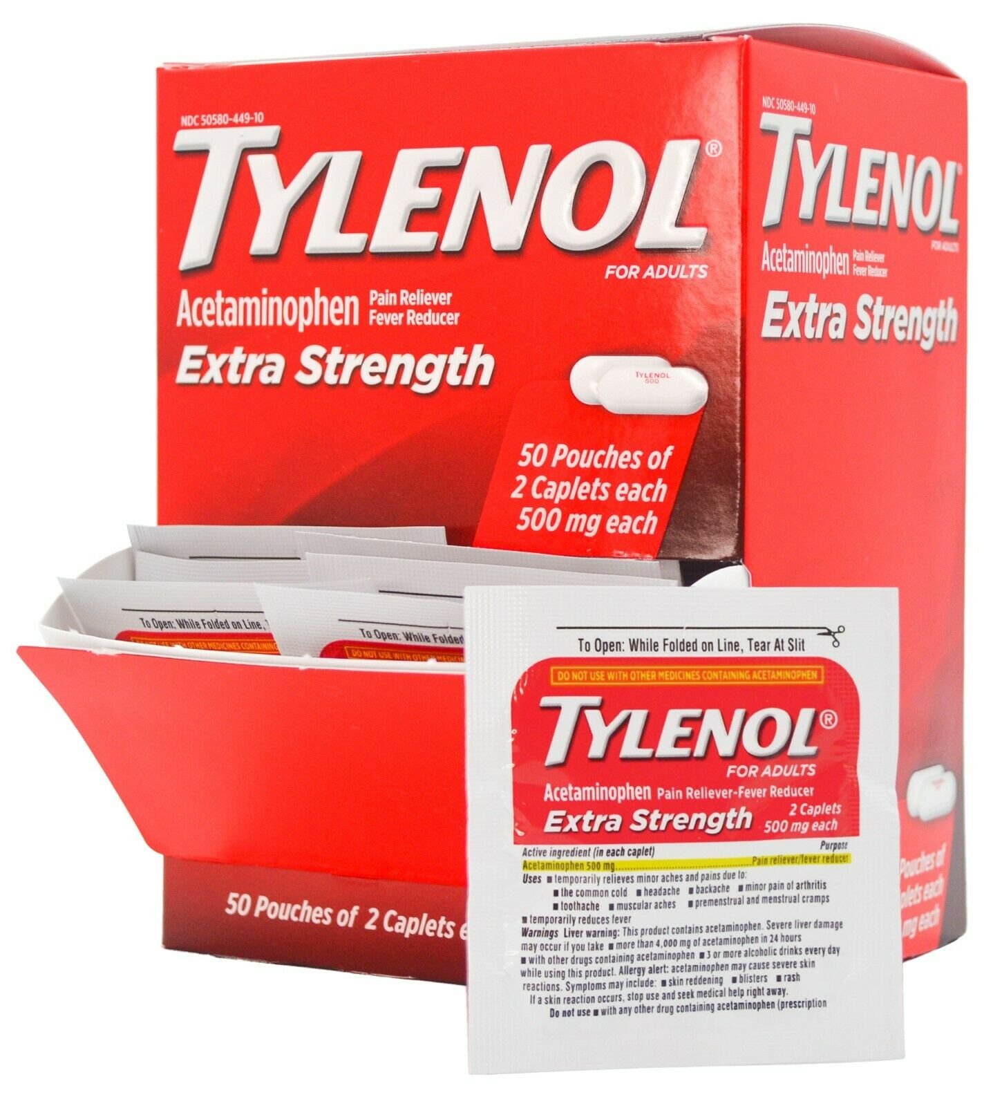 Extra-strength Tylenol - 50 2-Packs - 100 Tablets Per Dispenser BoxWhen you need something stronger, extra-strength Tylenol , provides effective relief for minor aches and pains due to headache, muscular aches, backache, arthritis, the common cold, toothache, menstrual cramps, temporarily reduces fever. Active ingredient: Acetaminophen 500 mg.