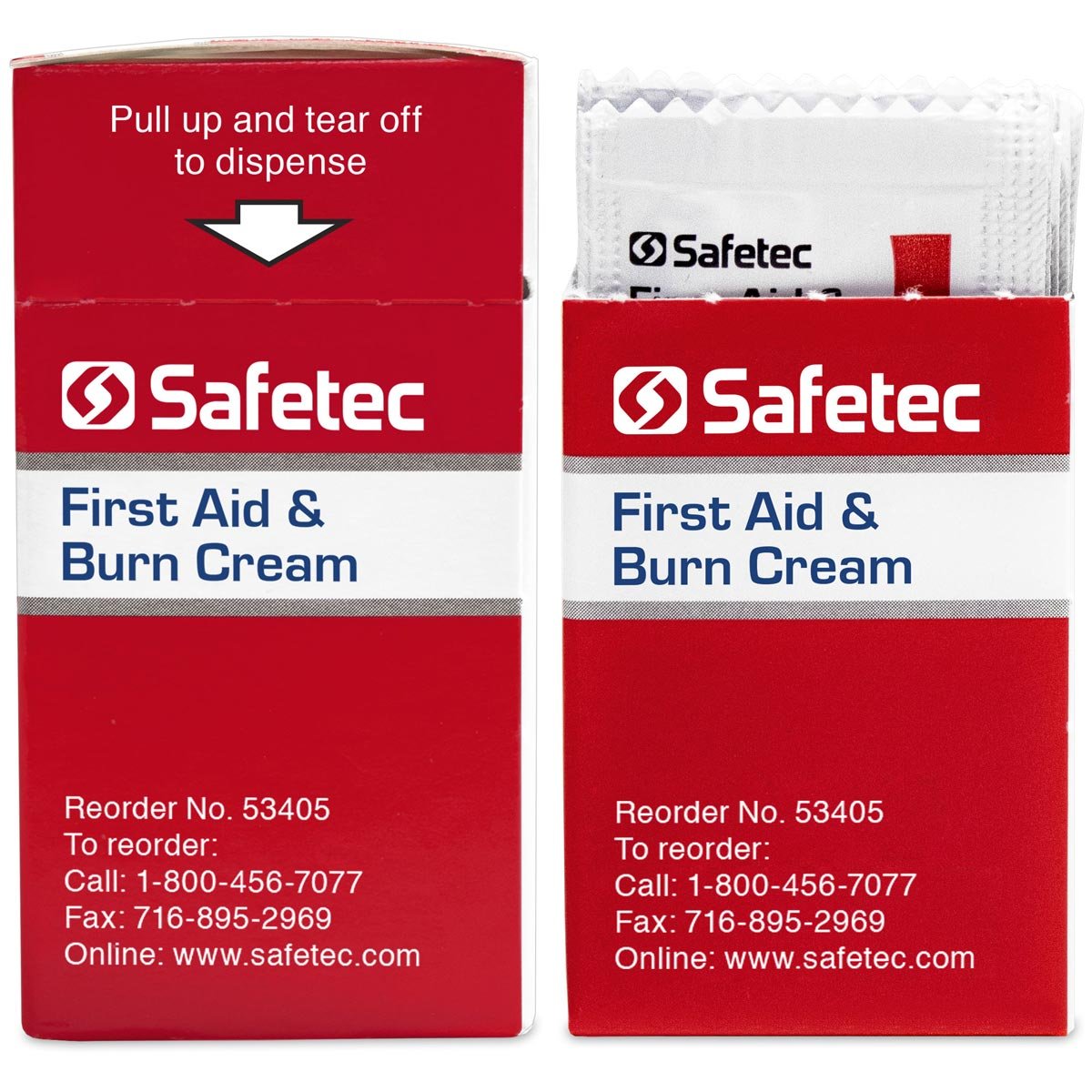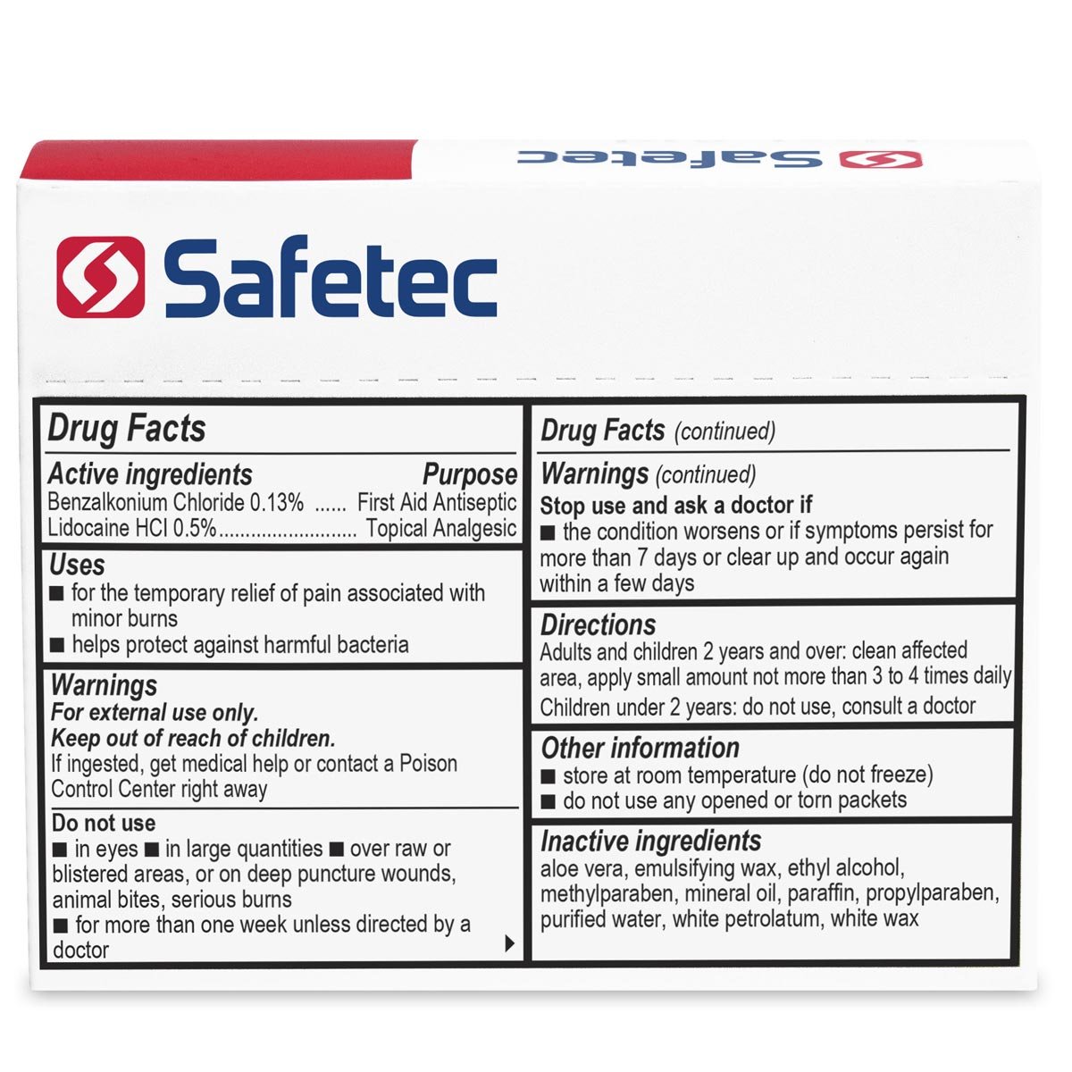 Safetec® First Aid & Burn Cream Helps relieve pain and protects cuts, scrapes and burns against contamination. First Aid & Burn Cream is non-greasy and non-irritating. Keep them in your purse, backpack, pocket or glove compartment. Great for on the spot use at home or at work. Packaged in convenient 25 ct. dispenser box. Contains: Benzalkonium Chloride and Lidocaine HCL. For temporary relief of pain associated with minor burns Effective Against MRSA and E. Coli Helps protect against harmful bacteria Increased Expiration Dates Industry-Leading Shelf Life See our First Aid & Burn Cream informational PDFBuy American Safetec manufactures higher quality products by following strict compliance regulations with faster shipping advantages. 0.9g First Aid & Burn Cream (25ct. Box)Pouch: 1.25" x 2.48" / Box: 3.25" x 1.38" x 2.63"NDC 61010-5701-5