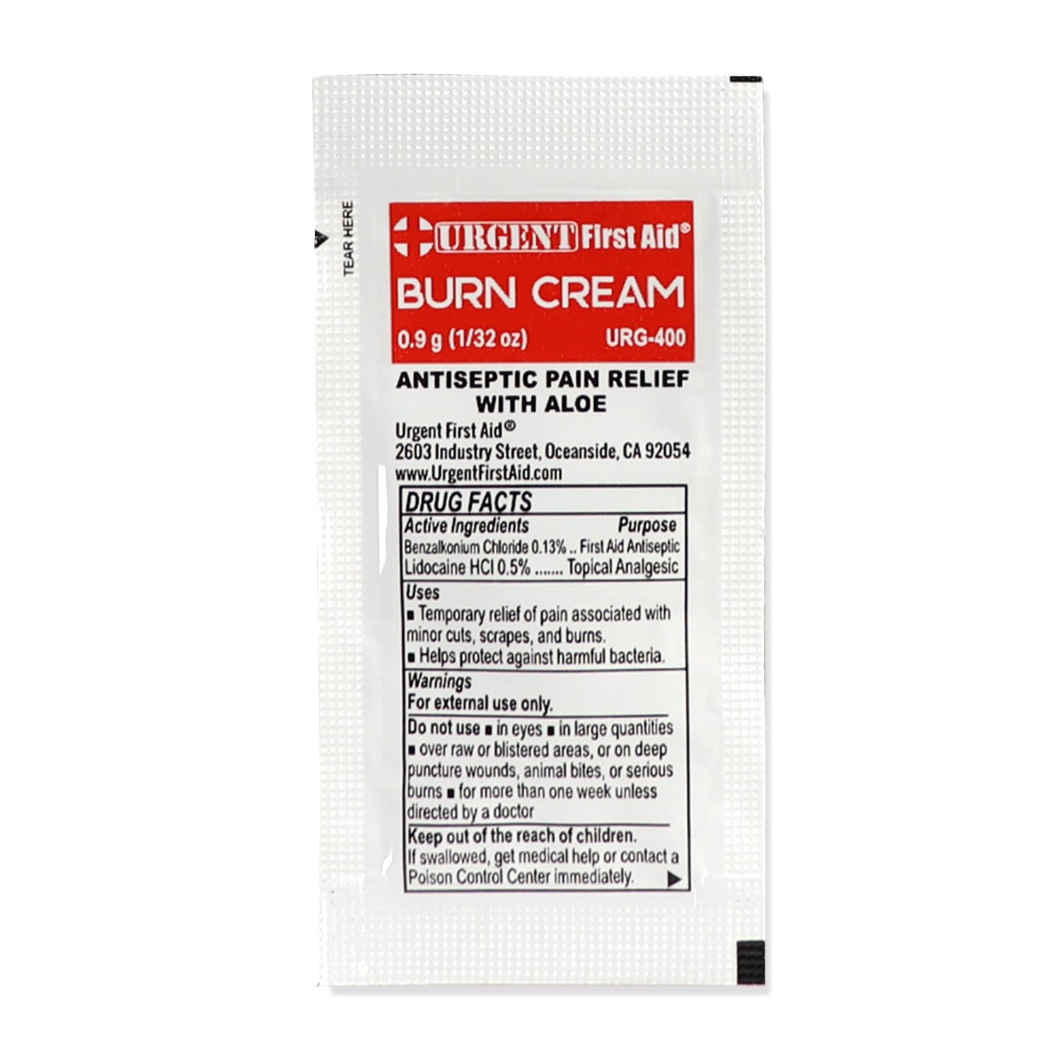 First Aid & Burn Cream .9gram, 25 Packets Per Box This first aid antiseptic and external analgesic helps prevent infection and relieves pain due to minor cuts, scrapes, and burns. Unit dose packages provide quick, effective application without cross-contamination. Active ingredient: lidocaine HCL 0.5%, benzalkonium chloride 0.13%. Helps protect against harmful bacteria and infection from minor scrapes and burns. Urgent First Aid Burn Cream is a Topical Anesthetic Pain Relief and Numbing cream and is a must have product in your first aid kit. Keep Urgent First Aid Burn Cream Packets in your medicine cabinet, car, camping bag, purse, kitchen drawer, kid's backpack, and even your travel carryon luggage. The convenience of the packet size allows you to take it anywhere. This product is made with high quality ingredients Lidocaine and Benzalkonium. Manufactured in accordance with the highest pharmaceutical manufacturing processes and contains a NDC for 100% confidence.