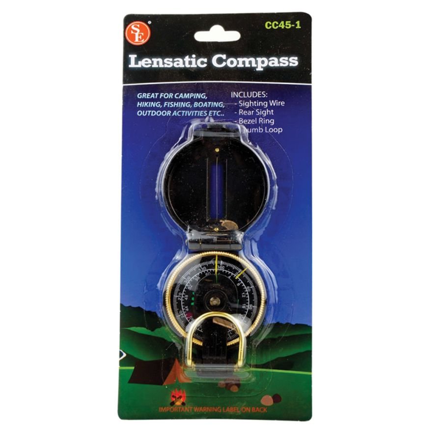 Lensatic Pocket Compass Never be lost again...You will always be able to find your way with this pocket compass. This Lensatic Compass - also called a military compass - is the tool you need while camping, hiking, hunting, boating, fishing, and other travel/outdoor activities. Its lightweight and compact qualities make it easy to store and transport in your pocket, backpack, survival pack, purse, etc. Features: Lightweight & compact size  Compass diameter: 2”  Sighting wire with cover  Bezel ring with index line & 45-degree line  Rear sight  Thumb loop  Color: Black (with gold accents) Directions: Compass-to-Cheek Method (more accurate):  Open and fold the cover of the compass to a vertical position. Fully unfold the thumb loop and angle the rear sight to about 45 degrees. When the compass is held up to your cheek, the rear sight should clearly magnify the compass dial. If the compass dial is not in focus, adjust the angle accordingly. Place your thumb in the thumb loop and rest the bottom of the compass on your fingers. Use the index finger to hold the compass in place. Hold the compass next to your cheek and align to the desired location with the sighting wire. Then look at the dial to get a reading. Compass Hold Method: Fold open and hold the compass between waist and chest.  Place thumb in the thumb loop and rest the bottom of the compass on your fingers. Use index finger to hold the compass in place.  Point the compass toward the desired location and look at the dial to get a reading.