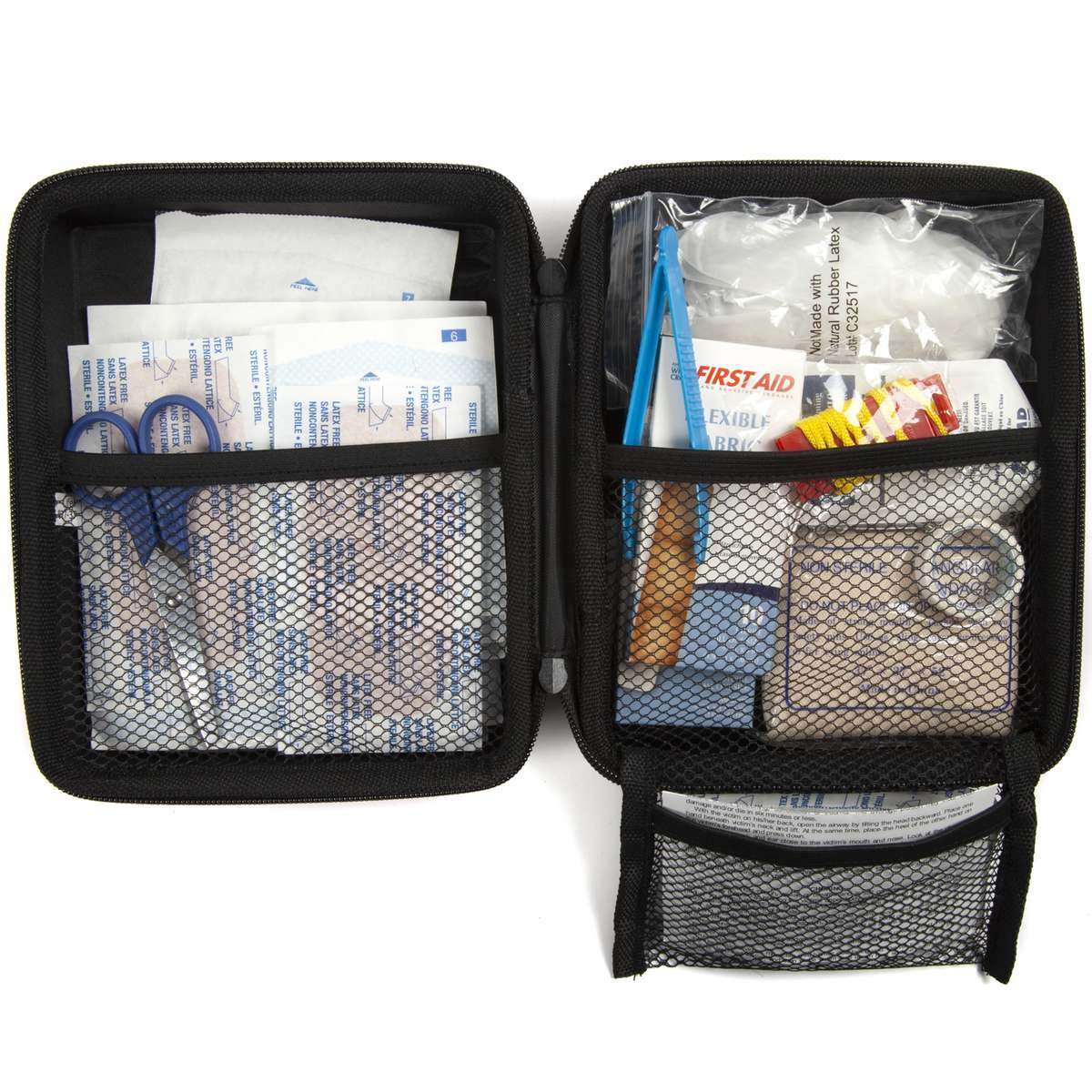AAA Commuter Kit Model: 4184AAA A very well stocked first aid kit in a sturdy EVA case that stores conveniently in your trunk to provide peace of mind. Contents: (1) Premium Quality Carrying Case (1) Carabiner (1) First Aid Guide (1) Scissors (1) Tweezers (2) Vinyl Gloves (1 Pair) (1) Emergency Whistle (3) Sting Relief Pads (6) Antiseptic Towelettes (14) Alcohol Prep Pads (1) Triangle Bandage (1) 5" X 9" Combine Dressing (20) 3/8" X 1-1/2" Bandages (10) 3/4" X 3" Bandages (10) Butterfly Closures (1) Knuckle Bandage (2) Knee/Elbow Bandages (1) 4" X 4" Sterile Gauze Pad (2) 3" X 3" Sterile Gauze Pads (4) 2" X 2" Sterile Gauze Pads (1) 2” Conforming Gauze (1) 1/2" Adhesive Tape 85 Total Pieces