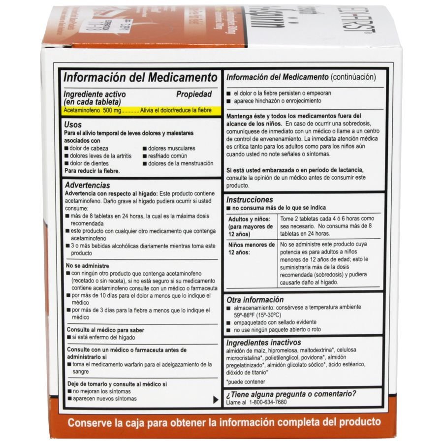 Compare active ingredient to Extra Strength Tylenol Extra Strength Non-Aspirin, 250 tablets per box, 125 packets of 2 tabs each High potency, aspirin-free relief from pain and discomfort associated with colds, arthritis, headache, muscle ache, menstrual cramps and fever Easy-to-swallow, film coated tablets Unit dose packets Spanish labeling where possible Each tablet contains: Acetaminophen 500mg Inactive ingredients corn starch, hypromellose, maltodextrin*, microcrystalline cellulose*, polyethylene glycol, povidone*, pregelatinized starch*, sodium starch glycolate*, stearic acid, titanium dioxide* *may contain Suggested Use: headache muscular aches minor arthritis pain common cold toothache menstrual cramps temporarily reduces fever Directions: do not take more than directed Adults and children: (12 years and older) Take 2 tablets every 4 to 6 hours as needed. Do not take more than 8 tablets in 24 hours. Children under 12 years: Do not give this adult strength product to children under 12 years of age; this will provide more than the recommended dose (overdose) and may cause liver damage. Other Information: store at room temperature 59º-86ºF (15º-30ºC) tamper-evident sealed packets do not use any opened or torn packets