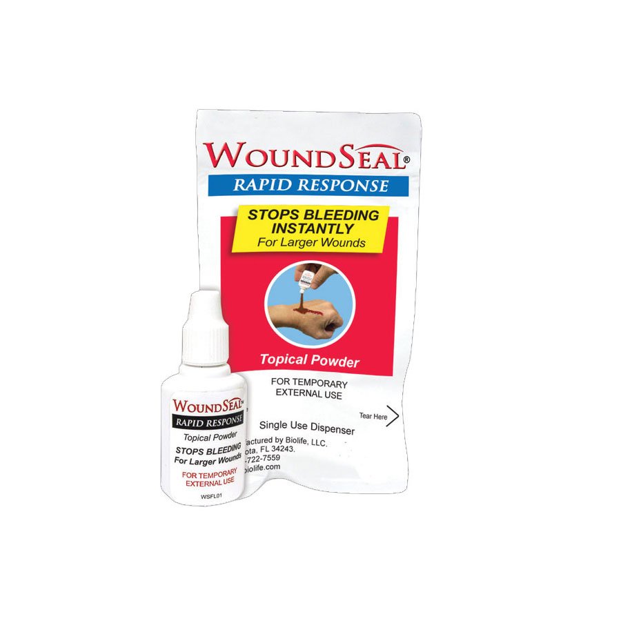 QR Wound Seal Rapid Response - For larger wounds or multiple cuts and lacerations Bleeding injuries cost more than you think. Wound Seal helps workers get back to work quickly, reducing employee downtime. Wound Seal can help minimize unnecessary trips to the ER and help reduce OSHA-reportable events – Wound Seal is not OSHA-recordable as it is considered “first-aid” treatment. Unlike other first aid products, Wound Seal is the only product that forms a seal over the wound. This seal stops bleeding, allows the body’s own mechanism to begin healing. The seal falls off naturally as the wound heals. Powder Pays for itself... Helps workers get back to work quickly... reducing employee downtime Minimizes unnecessary trips to the ER Results in fewer OSHA-recordable events - Wound Seal is not OSHA-recordable as it is considered “first-aid” treatment. Is Fast and Effective… Stops bleeding in seconds and forms a protective seal allowing nothing into or out of the wound   Works independently of the blood clotting cascade – even people who tend to bleed easily. Is Easy to Use Needs blood to work Nontoxic, hypoallergenic and does not cauterize the skin Not metabolized by the body – it is not a drug Pour Wound Seal Powder on bleeding wounds and apply pressure for 30 seconds Portable packaging to stop bleeding at the point of injury ...and is a Proven Technology Used by leading hospitals Used by pro sports teams Used in thousands of occupational workplaces
