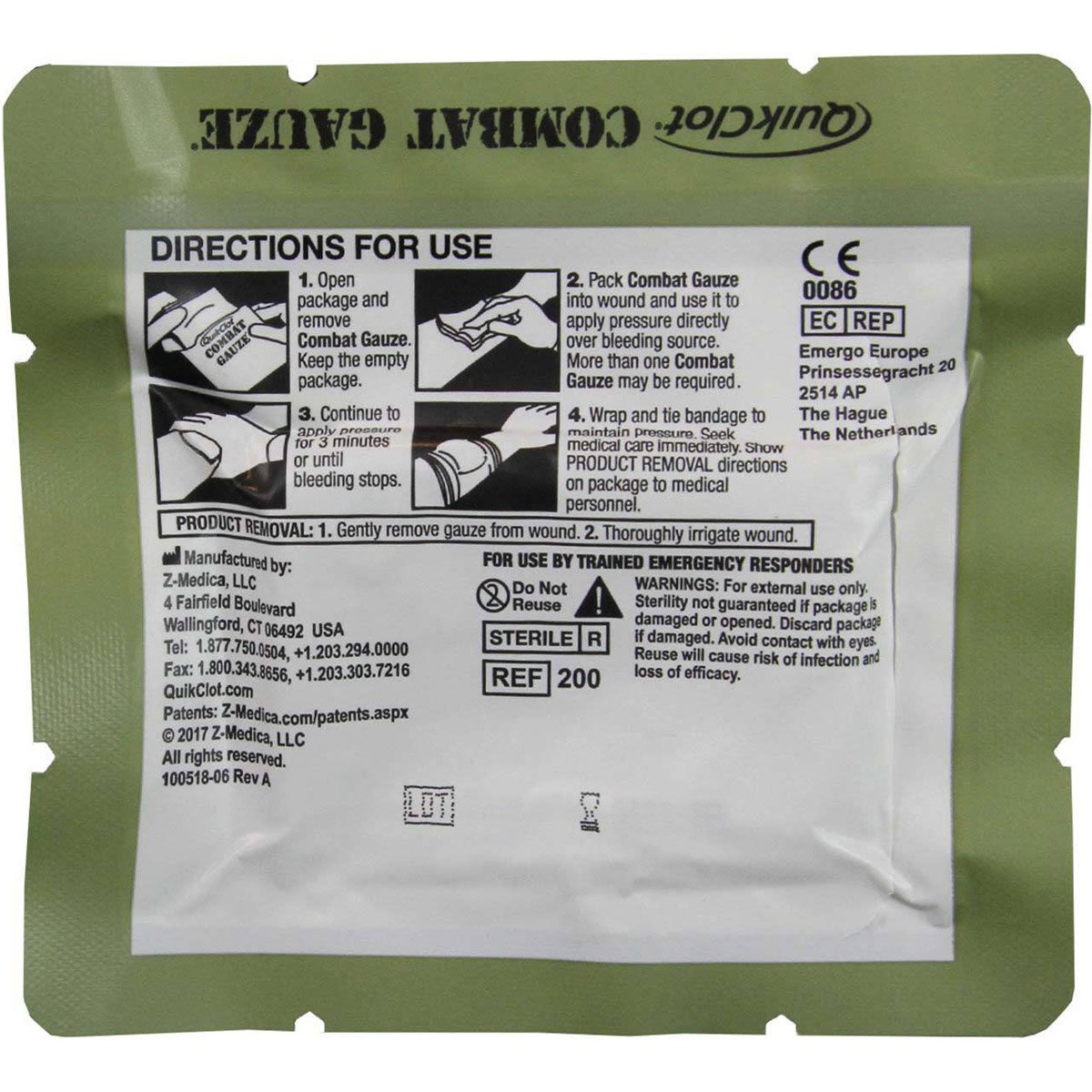 QuikClot Combat Gauze, Military (3-inch x 4-yard z-folded) QuikClot Combat Gauze is a 3-inch x 4-yard strip of z-folded soft, white, nonwoven, hydrophilic gauze impregnated with kaolin, an inorganic mineral that is both safe and effective in accelerating the body’s natural clotting cascade without any exothermic reactions or use of animal or human proteins. QuikClot Combat Gauze contains an X-ray detectable strip for easy identification. Each QuikClot Combat Gauze, Item #200, NSN 6510-01-562-3325 is packaged in an easy-tear pouch, vacuum sealed. Indicated for temporary external control of traumatic bleeding, the QuikClot Combat Gauze is flexible and pliable and contours to all wounds. Effective, simple, and safe to use when trying to control life-threatening hemorrhage from wounds that are not amenable to tourniquet application Z-fold, vacuum packed for easy application Contains an X-ray detectable strip for easy identification Does not generate heat Easy to use and remove Flexible and pliable Individually wrapped in an easy rip, military-grade foil pouch QuikClot Benefits Works Fast - This gauze contains kaolin, an inorganic material that speeds up the body's natural clotting process, helping blood clot up to five times faster than on its own. Safe - Kaolin is a common mineral that doesn't contain any plant, animal, or human material, so you don't have to worry about causing allergic reactions. Easy to Use - The dressing easily conforms to any wound site and doesn't break down or fall apart under pressure. Convenient - Contained in durable, yet easy-to-tear packaging, these packets can go anywhere.