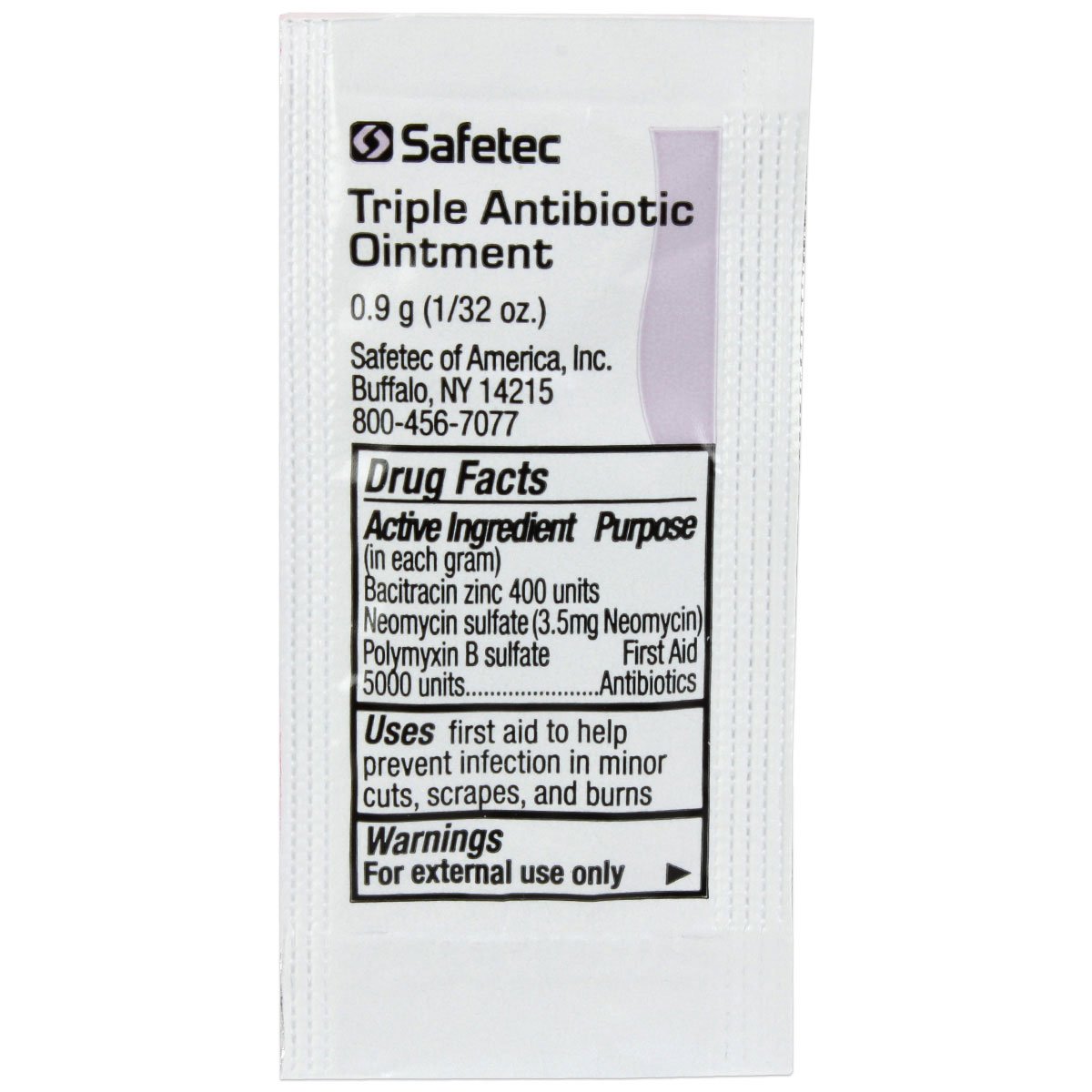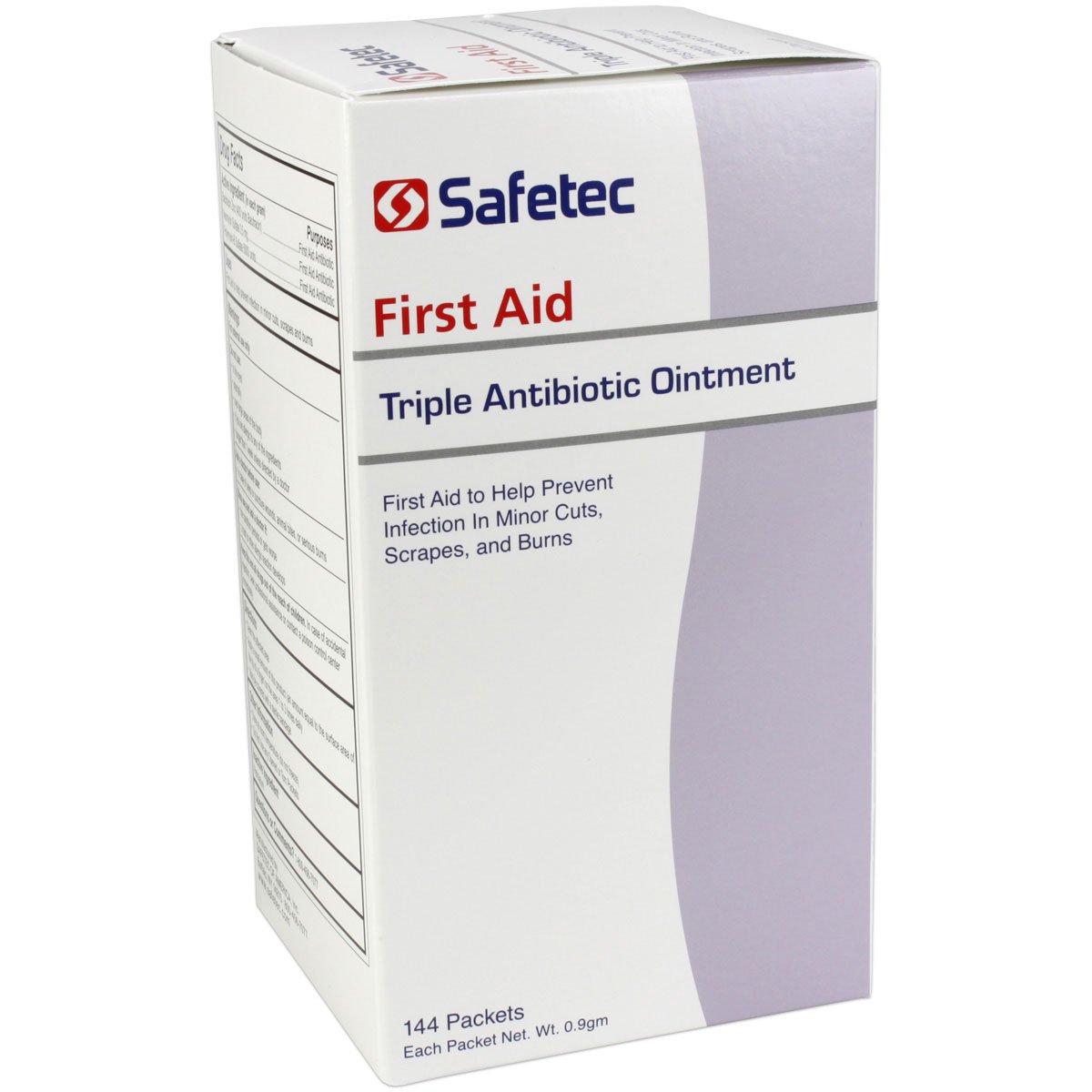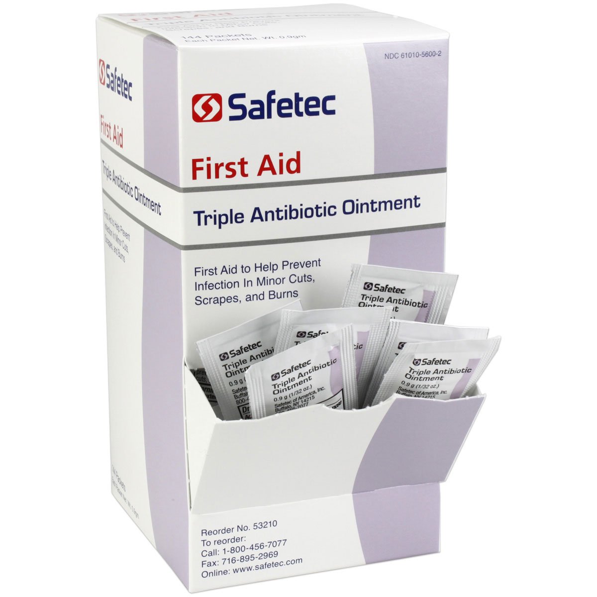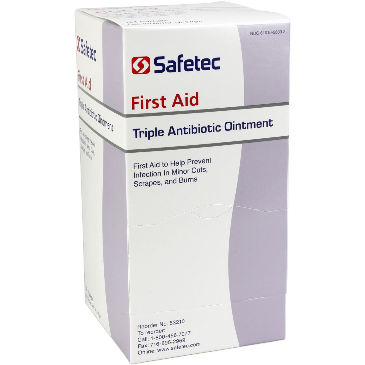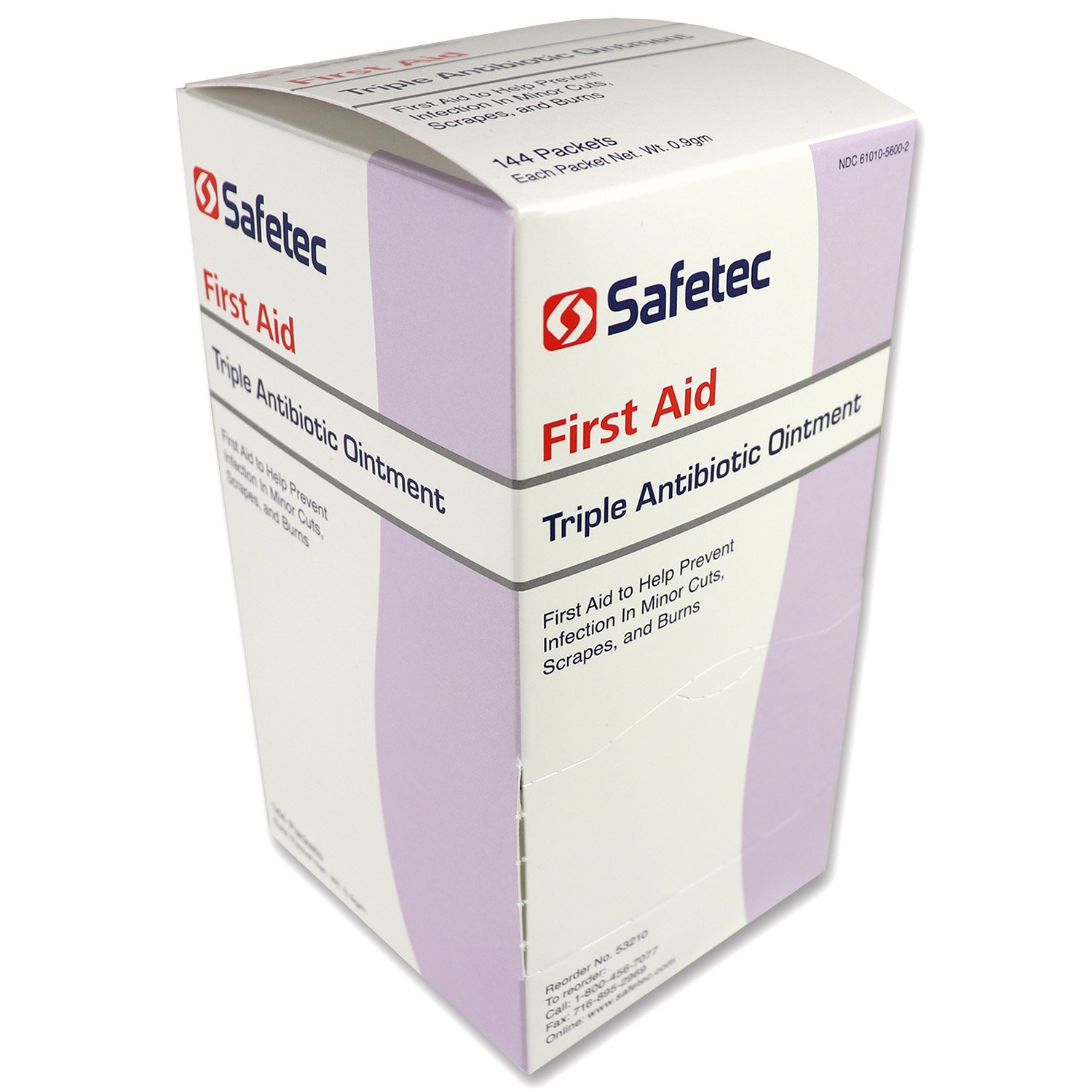 Safetec® Triple Antibiotic Ointment contains Bacitracin, Neomycin and Polymyxin B to help prevent infection. It aids in the healing of minor cuts, scrapes and burns. Apply 1 - 2 times daily for optimum results. First aid to help prevent infection in minor cuts, scrapes, and burns Increased Expiration Dates Industry-Leading Shelf Life Triple Antibiotic Ointment (Contains Bacitracin Zinc, Neomycin Sulfate and Polymyxin-B Sulfate) Convenient single-use packaging in 144 count dispenser box is easy to use for fast application and instant relief. Simply apply on minor cuts, burns and scrapes. Buy American Safetec manufactures higher quality products by following strict compliance regulations with faster shipping advantages. .9 g. Pouch (144 ct. Box) (53210)Pouch: 1.25" x 2.48" / Box: 3.25" x 3.5" x 6.38"NDC 61010-5600-2